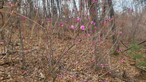 아직 밤 기온은 영하를 보이는데 농장 한켠의 진달래꽃이 수줍은 미소를 보인다